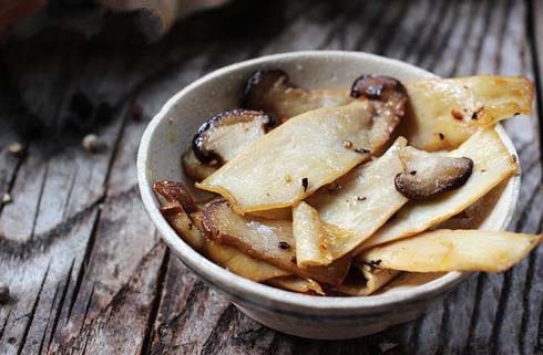 1、杏鲍菇洗净后切成片,厚度约为两到三枚硬币厚度左右,不要切太薄;