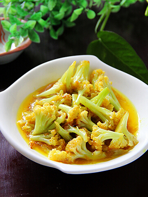 【主材】:有机菜花 300克、咖喱块 2块、 芝麻 适量
