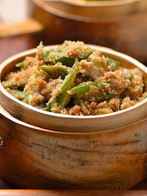 8、将拌好的秋葵装入笼中;蒸锅里水烧开后,放入蒸笼,中火蒸10分钟,即成。