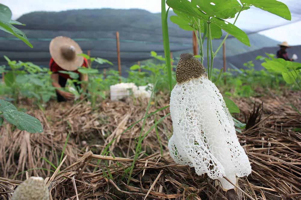 竹荪为真菌植物门真菌长裙竹荪和短裙竹荪去掉头部的子实体,是世界著名的食用菌。 竹荪又称"真菌之花"、"植物鸡"等,名列"四珍"(竹荪、猴头、香菇、银耳)之首。竹荪以其身形俊美动人而闻名,其鲜品形态犹如一个穿着雪白蕾丝裙的姑娘,堪称"雪裙仙子"。它具有延长汤羹等食品存放时间、保持菜肴鲜味不腐不馊的奇特功能,一向被帝王列为御膳,现在则是国宴中不可缺少的一味山珍。