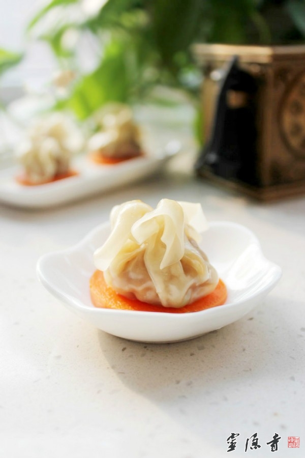 4、将馄饨皮的上边用手抻开,一个小烧卖就包好了。