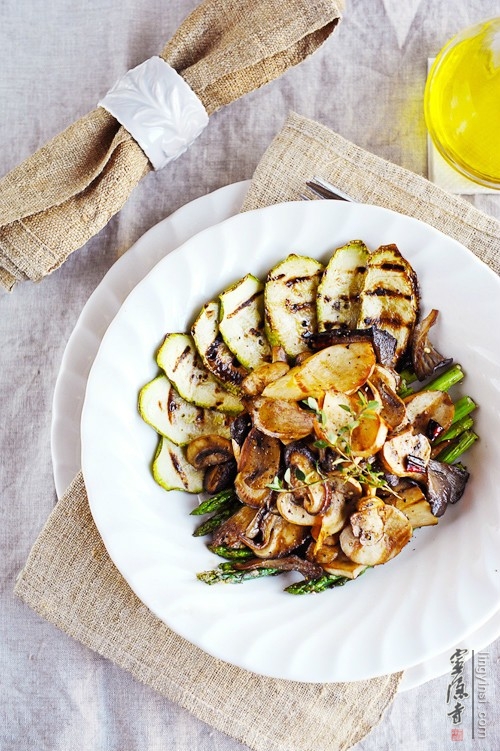 【原料】:蘑菇(口蘑+平菇+香菇+杏鲍菇)500g,西葫芦半个,芦笋50g。