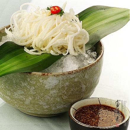 5. 吃时挟着山药丝,放入步骤(3)的调味料中浸一下,就可以吃了。