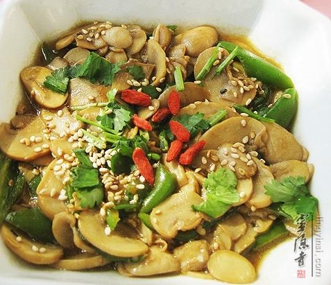 [主料]:白蘑菇、青椒、红椒、香菜、芝麻