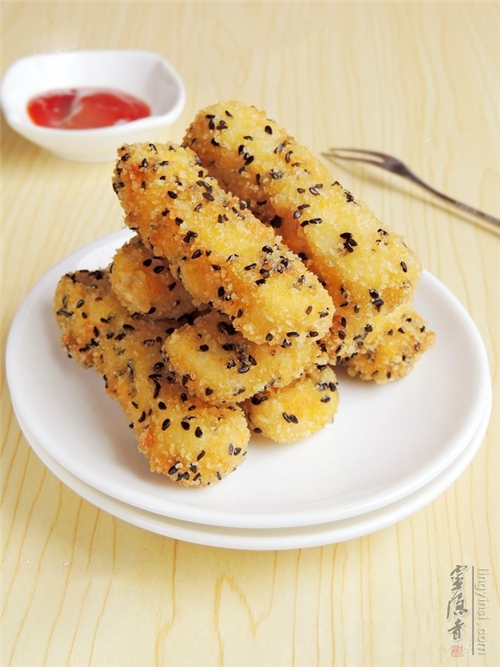 辅料:植物油300毫升、盐1茶匙、淀粉100克、黑芝麻适量、番茄酱2汤匙炸金条的