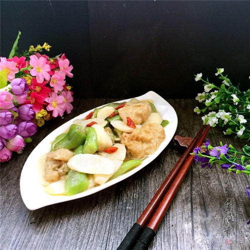 2、起油锅,放入丝瓜和山药翻炒,翻炒一分钟后再放入油面筋继续翻炒。
