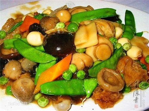 香菇(80g)、口蘑(60g)、荷兰豆(300g)、木耳(80g)、西芹(60g)、青笋(80g)、青椒(20g)。