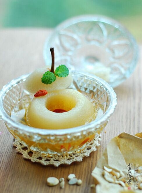 梨洗净,去皮,切去顶部当做盖子,再挖除中间的核。