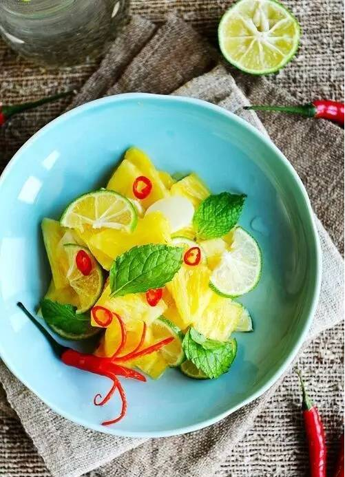 食材:菠萝、泰国柠檬、小米椒、薄荷、盐