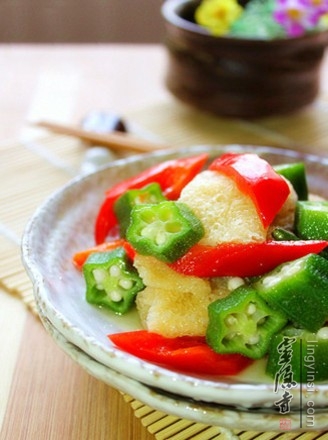 6.红椒和秋葵一起倒入锅内,少许植物油翻炒片刻,秋葵已经汆烫过,翻炒时间不可过长