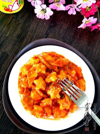 1.胡萝卜洗净切片,准备好韩国辣酱和年糕热锅热油。