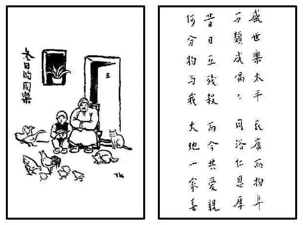 《护生画集》第1集中有一幅《冬日的同乐》,画面中祖孙二人并坐于家门口,鸡鸭猫狗萦绕身旁,窗台上又有花草招展,一切都是那么的谐和。观此画,我们可以体验到人与"非人"的和谐,从"浑然与物同体"中获得愉悦。画作呈送弘一法师后,法师为其题了一首诗,当中有一句:"何分物与我,大地一家春!"此诗深刻剔发了丰子恺护生情怀与万物一体观念的联系。丰子恺认为万物一体是最伟大的世界观,故坚决反对个体之间的相互侵伐:"并育于大地上的人,都是同类的朋友,共为大自然的儿女。""天下如一家,人们如家族,互相亲爱,互相帮助,共乐其生活,那时陌路就变成家庭。"在此基础上,他进一步反对人与人之间相互戒备,主张打通人我之间的壁垒,真诚相待,坦诚而处。他在一篇随笔中写道:"例如锁,具体而又明显地表示着人类互相防备的用意,可说是人类的丑恶的证据,羞耻的象征了。