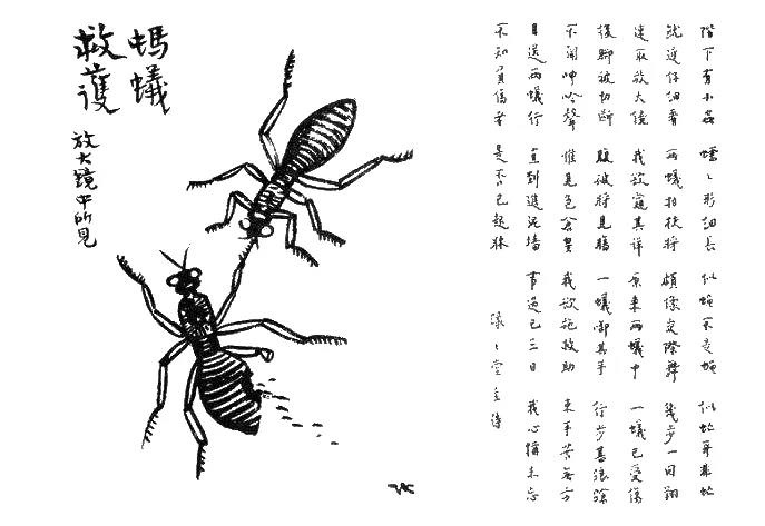 丰子恺认为:"能把自然当作人看,能化无情为有情,这便是‘物我一体’的境界。"丰子恺本人就是一个"能使无情尽有情"的典范,他的"多情"使他保有孩子般的天真,以此观照世界,世间一切都变 得那么有灵性,与他息息相通。在他看来,草木虫鱼亦有知。《护生画集》第5集中的《救护》画的是两只蚂蚁相互救助,丰氏题诗云:"始信含识者,无不具人性。"在画集中,我们还可以看到大量灵猪、义犬之类的漫画。丰子恺慨叹,禽兽尚且有人性,而很多人却丧失了人性,反倒不如禽兽:"我写到这里,忽把‘它’字改写为‘她’,把‘前足’改写为‘手’。排字人请勿排错,读者请勿谓我写错。因为我看见这熊其实非兽,已经变人。而有些人反变了禽兽!"的确,"我"而多情,则视物可以如人;"我"而薄情,则视人亦只如物。丰氏的这类漫画及随笔,无非是启示世人超越小我,视广大宇宙为与我感通的大生命,从而去加以护惜。在他看来,人有人生观,猫亦不妨有猫生观。其《物语》一文直接让动植物(葡萄先生、南瓜小姐……)出场,代言万物平等、各正性命之理。