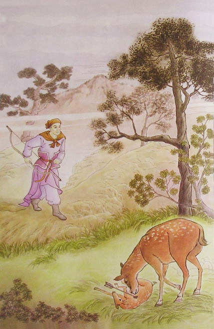 真君见此情景,非常惊奇,当剖开母鹿腹部时,发现柔肠寸寸断裂,恻隐之心,油然而生,只好就地埋葬。原来母鹿因哀怜儿子惨死,悲伤过度,以至肠断。真君大生悔恨,感悟人畜虽然有别,爱子之心,天性相同,怨艾自己,竟然如此残酷,伤害了天地骨肉之情。于是折断弓箭,从此不现畋猎。后来荐举为孝廉,官旌阳县令, 感晋室朝政紊乱,弃官司归隐,追随仙人吴猛受三清法要,入深山潜修,证了仙道。