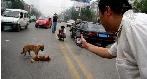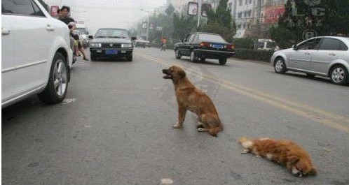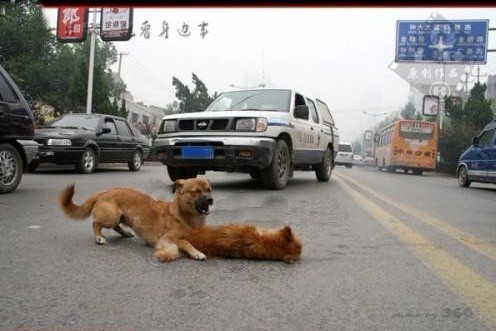 在滚滚车流中,一只黄褐色的小狮子狗躺在斑马线南边,另一只同样颜色的狗不停地用两只前爪拨躺在地上的小狗,只见那只狗一会儿低头亲吻小狗,一会儿抬头仰望匆匆而过的人群和车辆,不时发出悲伤的呜鸣。面对一辆辆呼啸而过的车辆,那只狗并没有一点胆怯的样子,反而全身掩护住小狗的身体,使尽全力想把小狗拖到路的对面。但是,毕竟它的力量是有限的,它一次次的努力都没有把小狗拖到路的对面。