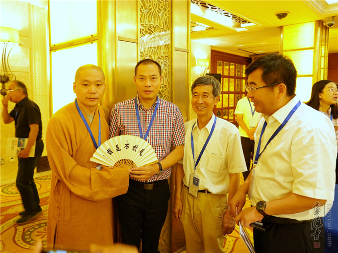 ▲觉亮法师向航空英雄机长刘传健赠送折扇