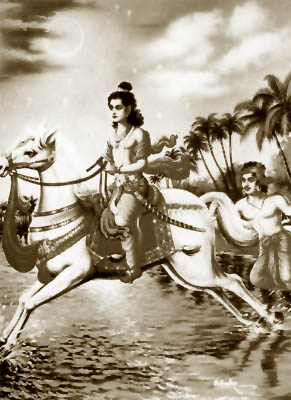 于是,悉达多王子与马夫画匿,一骑一步,乘着茫茫夜色,横渡清溪。到天明的时候,已达百里之外,走到了阿拔弥河边的深林,就是古跋伽仙人修苦行的地方。