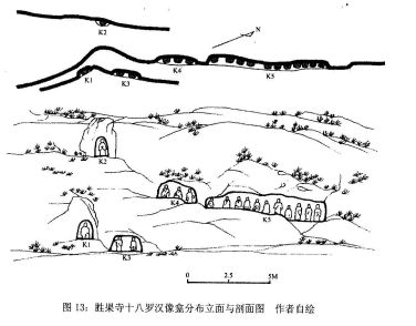 胜果寺十八罗汉像分五龛雕凿,且在崖面的高低位置不同。笔者将这五龛自左向右(即自南向北)依次编为五龛(K1~5),将各龛内的罗汉像也依这种顺序编为1~18(L1~18)。现述其基本特征如下: