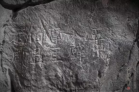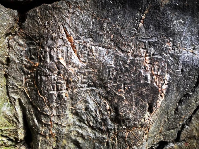 众人再次猫腰钻入石缝步,步步抬头,仔细查看。刚到转弯处,身后泶君大声直呼:"崖壁上有字"。