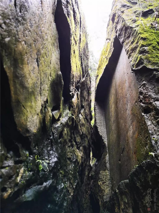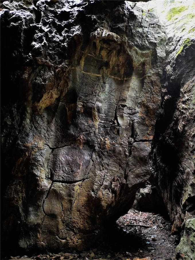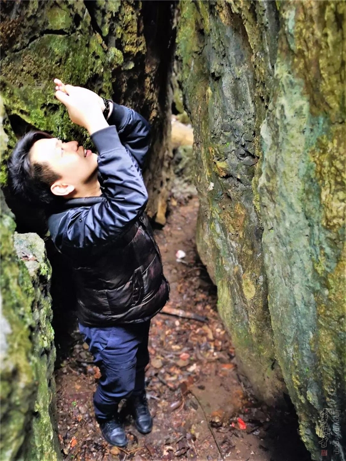 许是机缘巧合,笔者在再次拍摄"济公掌印"手心正中题刻的照片后查看照片,发现"济公掌印"石壁右侧尽头有一石缝,刚好容一人猫腰通过。莫非此处为"入壁五步"之处?