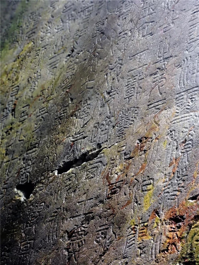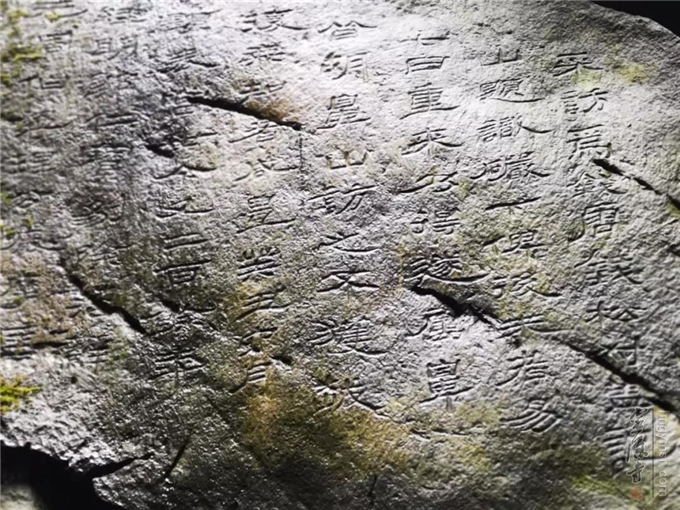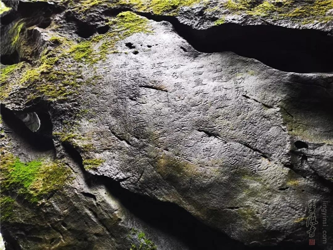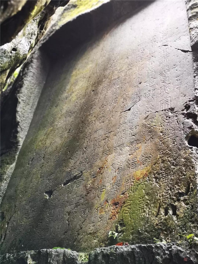 众人一起回头,看到苔藓崖壁刻有8行隶书,共76字。每字大6厘米见方,字迹保存完整,整篇隶书隽秀端庄,清晰可辩。