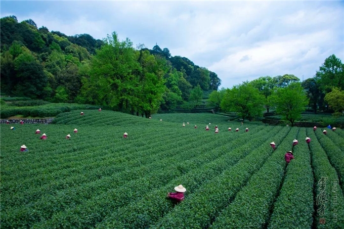 春雨染绿了田野、山峦,漫山翠绿的茶山上戴着斗笠的茶农忙着采茶。
