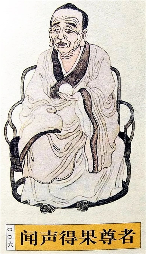 闻声得果尊者,五百罗汉第陆尊。闻,谓可听;声,为五尘之一耳根所对之境。据《持地论》说:"从他闻声而通达,故名声闻,"《大乘义章》卷十七则谓:"闻如来之言教而悟解,故曰声闻。"得果,为三乘圣人各得自乘之果法。