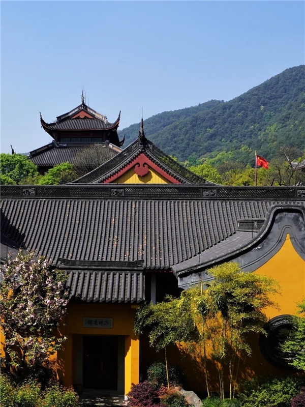 灵隐寺地处杭州西湖以西,背靠北高峰,面朝飞来峰,两峰相挟。
