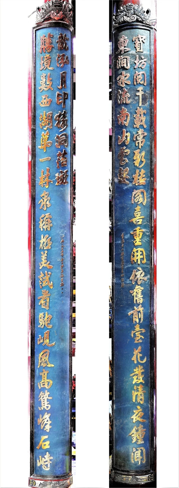 整联以饱含激情的笔墨,借联抒怀,赞誉东南佛寺之冠灵隐寺。千载常新、楼阁喜重开、前台花发、南山云起、试看驼岘风高、龙泓月印 、猿洞苔斑等联句,暗喻千年古刹,虽经坎坷,仍然高僧辈出,法脉延绵。