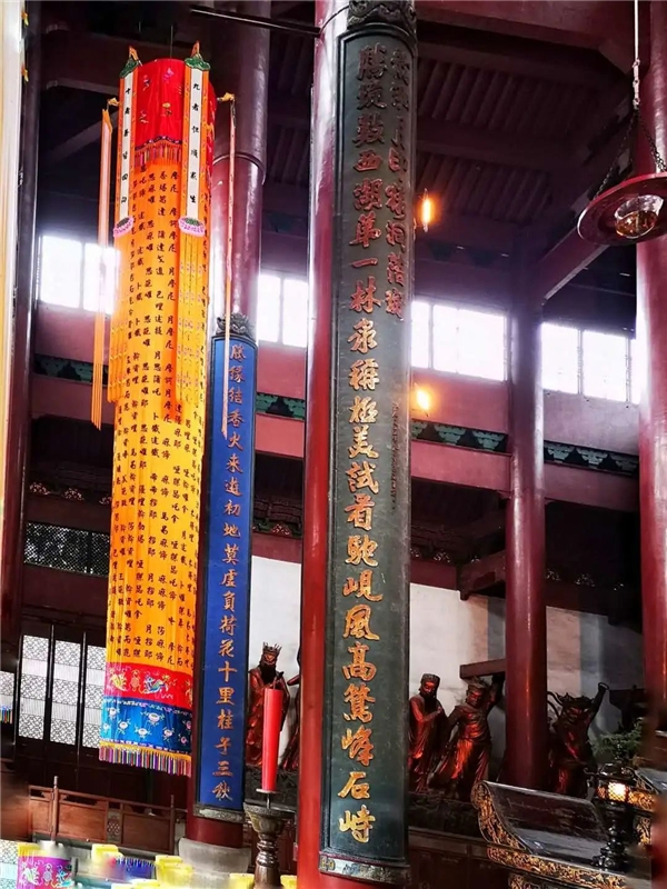 今天我们再欣赏一幅文化名人江庸先生撰写的一幅,挂在灵隐寺大雄宝殿正面抱柱上的一副楹柱联。