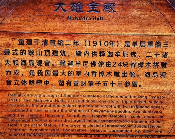 这幅勒在大雄宝殿正面石柱上的楹柱联,短短四十个字,向游人扼要告知灵隐寺的历史地位和成就。