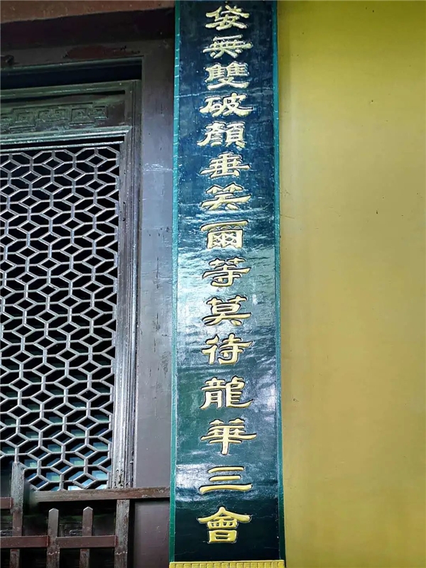 楹联的字面意思是,菩萨度生,没有一个不像弥勒菩萨这样,开口常笑,慈悲接引有缘众生,那么,你为什么还要去等“龙华三会”呢;弥勒不可思议、无所分别的“不二法门”就是“能容”,容一切有缘,而真正能趣入净土的“来人”,一定是一心念佛的人。此联即赞扬弥勒菩萨示笑的本怀和“不二法门”,同时开导善信,莫再等待,此生精进,一心念佛;心胸开阔度量大,积德行善能容忍,方能领悟佛教的真谛。