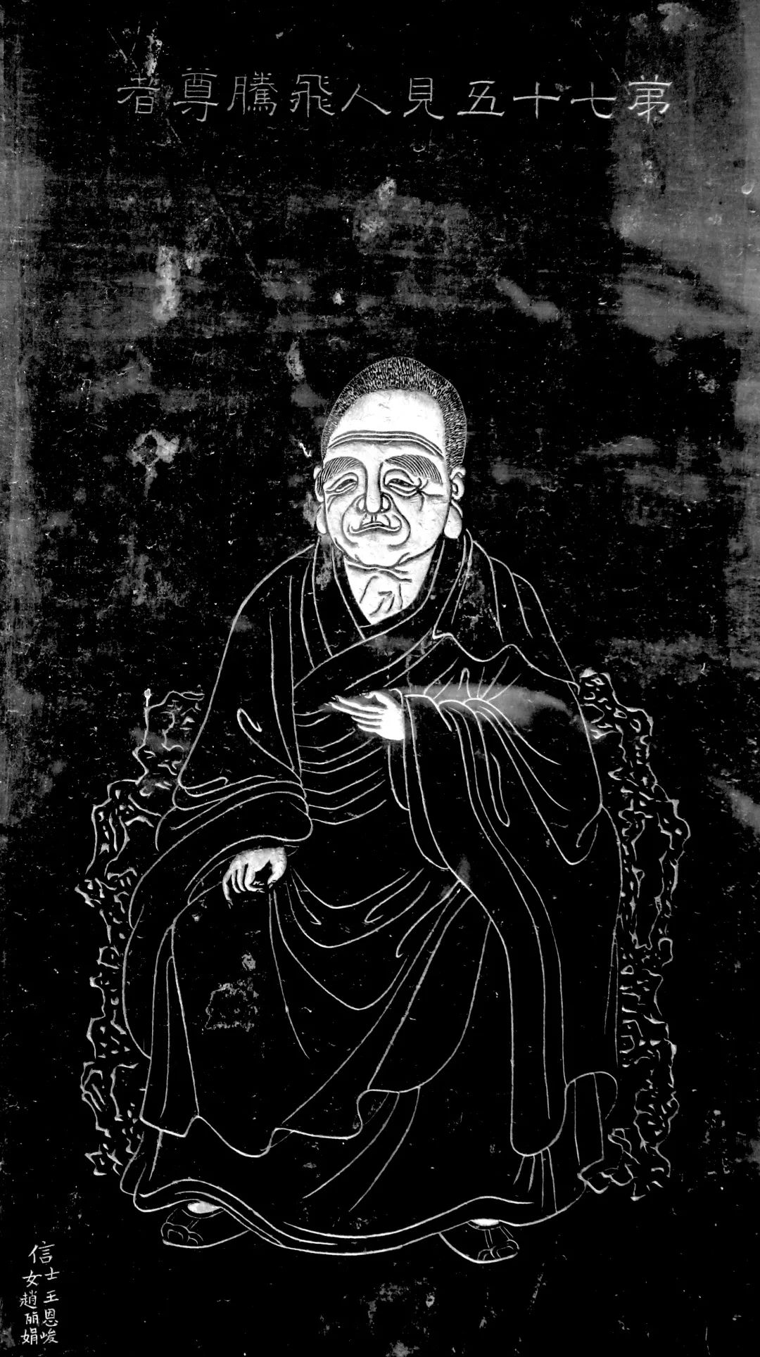 五百罗汉第柒拾伍尊见人飞腾尊者,即唐代名僧“腾腾和尚”仁俭。其籍贯、俗姓及生辰年月,僧史传记等均失于载。