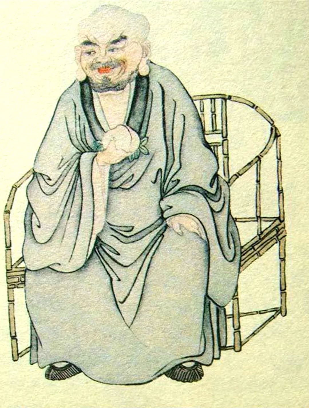 尊者法相所现为陶然端坐,左手扶膝,右手捧寿桃,头形奇异,长耳垂肩,浅须盈面,笑容可掬。尊者自幼博闻强记,聪慧过人,且能言善辩。