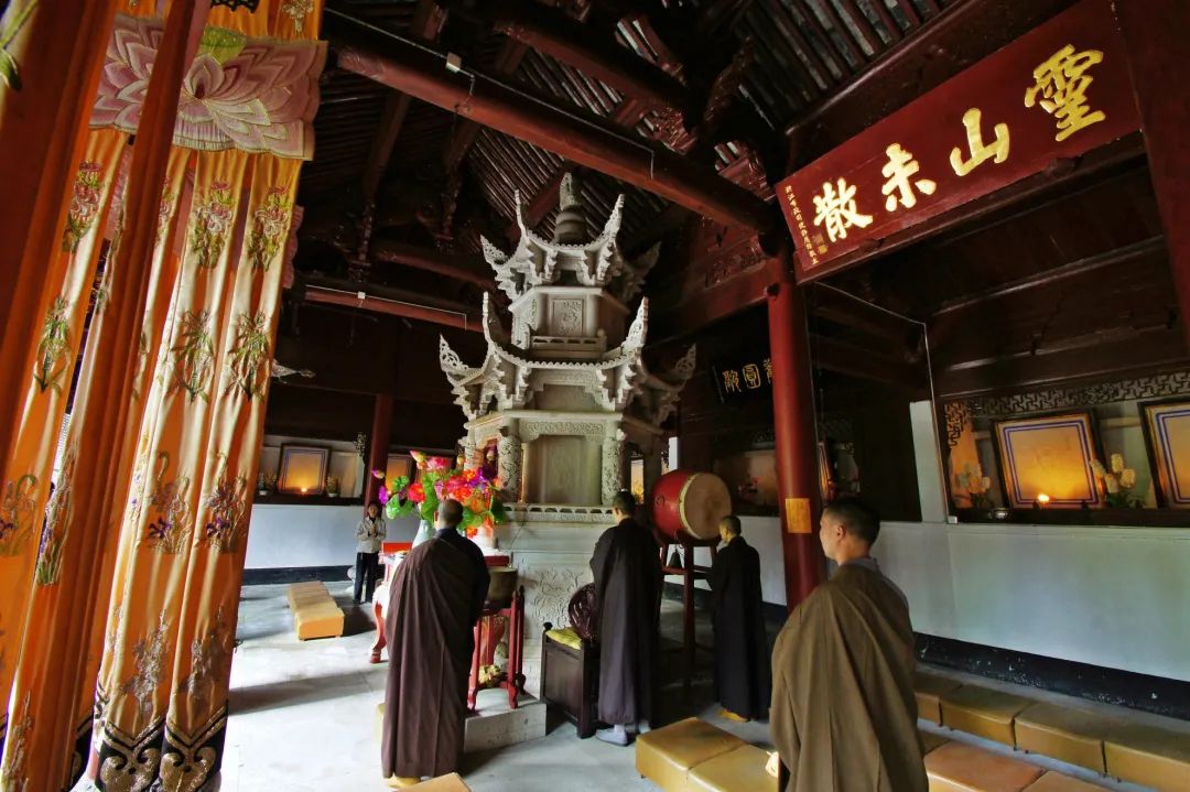 智者大师遂在此修法华三昧,晨昏精进。如此经过三日夜,在诵到《药王品》“是真精进,是名真法供养”时,智者大师顿感身心寂静,豁然入定,亲见灵山一会,证入法华三昧。得慧思禅师印可后,慧思禅师更为他开演教法。