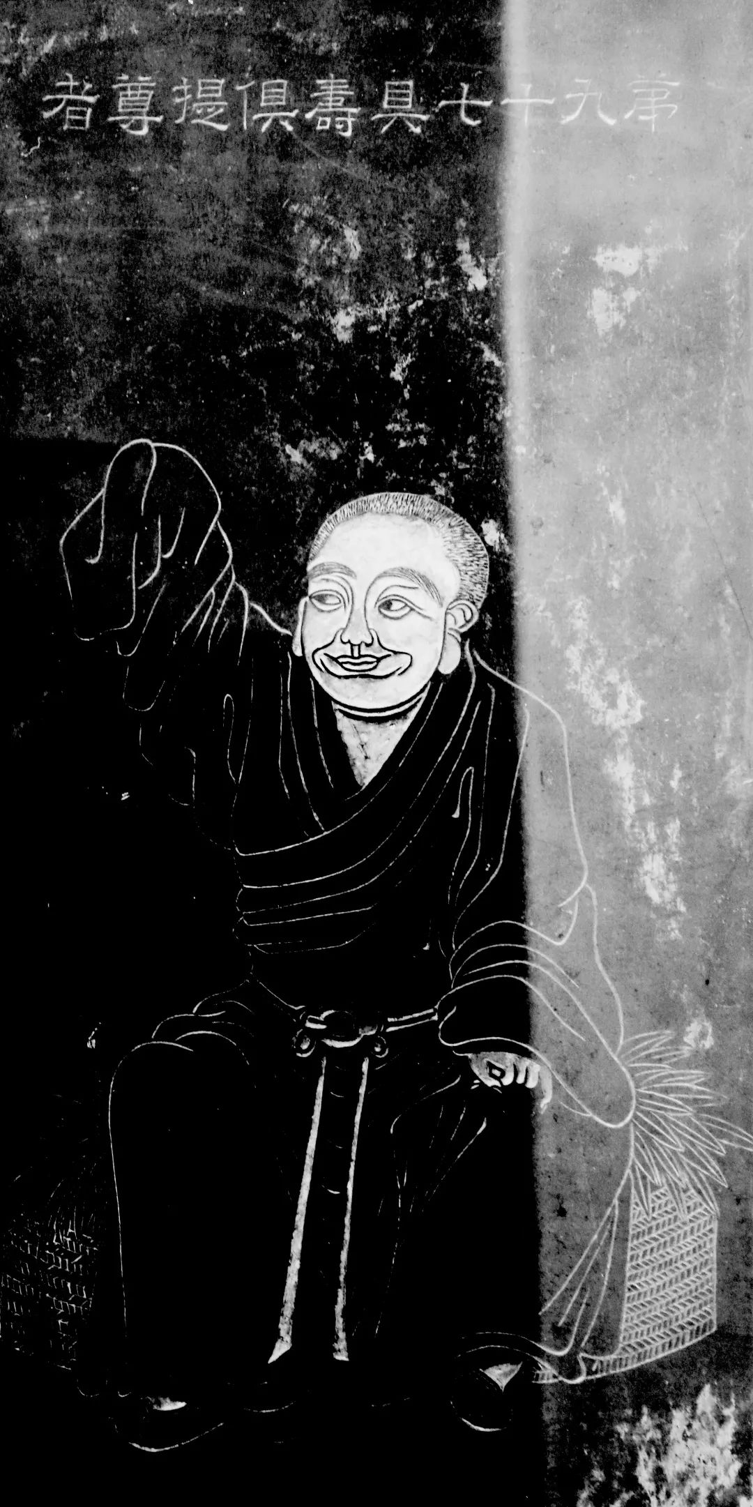 尊者法相所现为欣然而坐,左手抚膝,右臂朝天高举,神情开朗滑稽,实则豁达无忧。尊者虔心修佛,积极行善,求精纯之法,修养通达心性,人称“精进第一”。