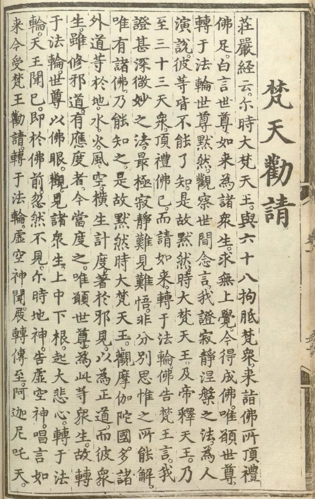 庄严经云。尔时大梵天王。与六十八拘胝梵众。来诣佛所。顶礼佛足。白言。世尊。如来为诸众生求无上觉。今得成佛。唯愿世尊转于法轮。世尊默然。观察世间。念言。我证寂静涅槃之法。为人演说。彼等皆不能了知。是故默然。