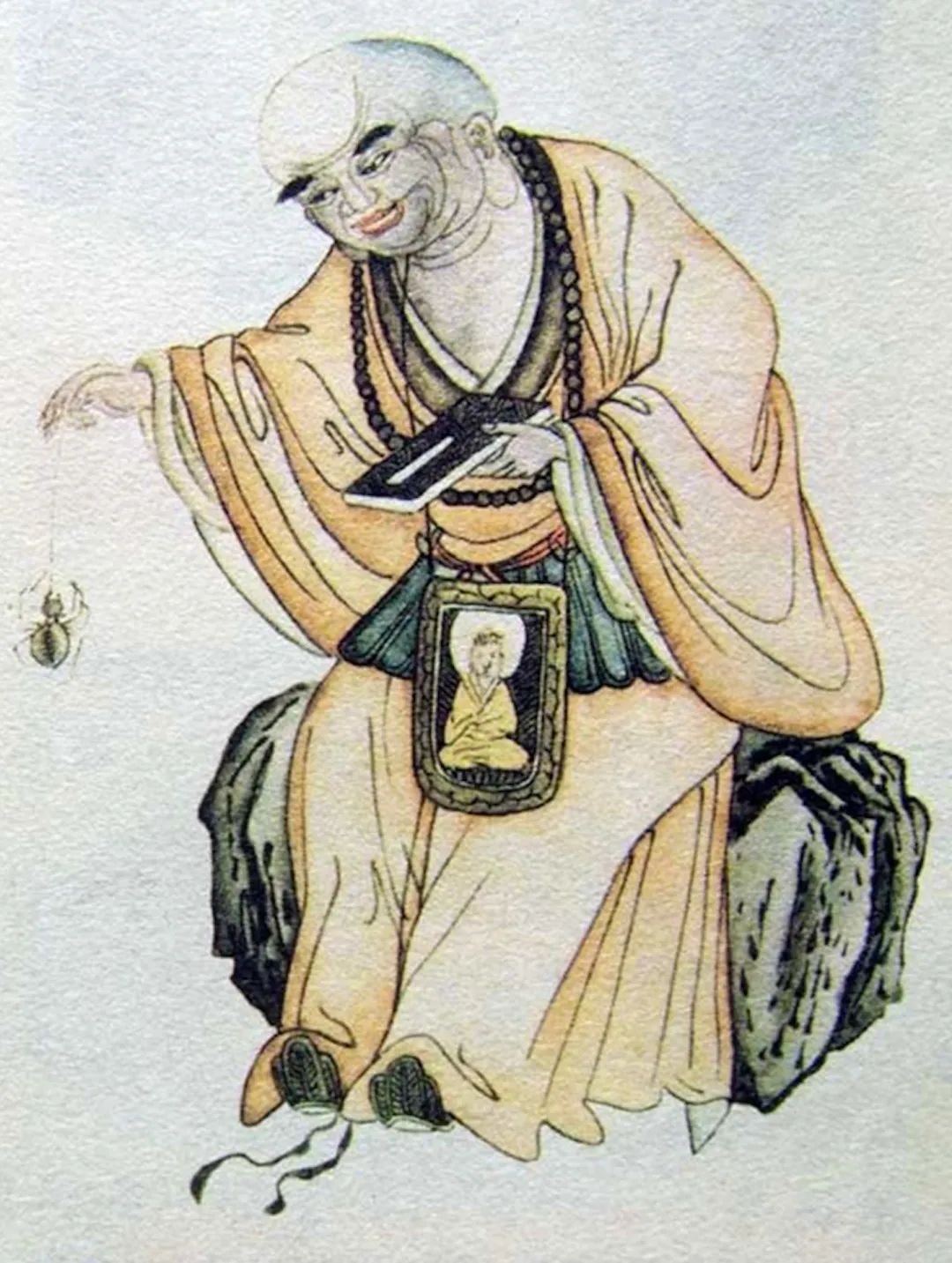 尊者法相所现为欢然静坐,左手执经书,右手挂蜘蛛,神情和乐,笑逐颜开。尊者佛心坚定,慎摄戒行,态度严谨,智慧高深,对色空的理解已达到喜乐金刚的境界。