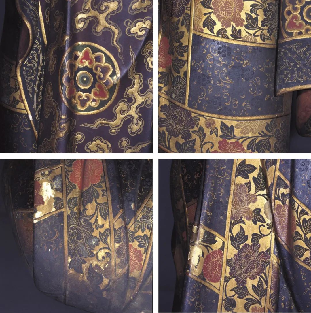 从阿难尊者站立的姿势看,这是一组雕塑中的一尊,似侍立在佛陀右侧的阿难尊者像。阿难尊者面相丰满圆润,衣饰华丽,造型俊朗端庄。眉清目秀,气质高贵。鼻挺小嘴,眼似青莲华,专注前方,深邃睿智,神态安详娴静,表情极为传神。圆圆的头形,圆圆的身躯,一切都是那么圆润圆满。身披中式袈裟,下着长裙,衣饰领口和袖口及裙摆等边缘处均饰有精美的花纹。衣衫厚重,自然流畅。雕工细腻,精美绝伦。身体微微偏向左侧,双手当胸合掌恭立。整尊雕像透出智慧、慈悲、安详、高贵之气质,很好的表现了阿难尊者俊秀庄严,智慧慈悲,高贵喜庆的内涵,是佛教造像艺术中极具写实传神的珍贵作品。历经800年,状态完好无损,甚至连彩绘痕迹都大多保留着,实属奇迹。文殊菩萨曾经这样赞叹阿难的庄严、多闻:“相如秋满月,眼似青莲华,佛法如大海,流入阿难心。”在佛陀十大弟子中,阿难记忆最强,仪容俊秀庄严,令见者心生欢喜。在当时僧团中年纪最轻,聪明而多闻。不但佛陀喜欢他,更有大众缘,尤其深得女众的尊敬。佛陀的姨母摩诃波阇波提夫人的出家,就是经阿难再三向佛陀请求,才得允许,于是有比丘尼僧团的成立。阿难有功于女人,所以女人也对他特别有缘,他是教团里里外外最受女人尊敬的人。