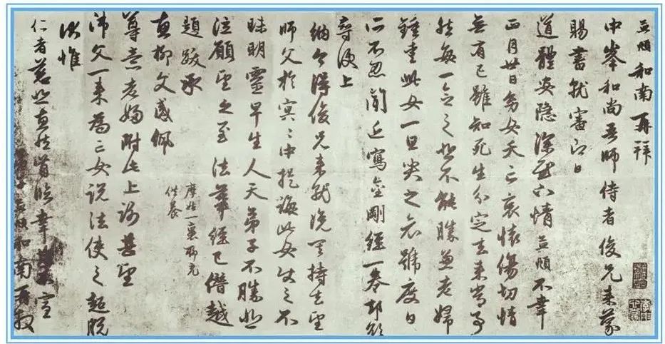 “十二月间,长儿得嗽疾寒热,二月十三日竟成长往,六十之年,数千里之外,罹此荼毒,哀痛难胜。”“虽明知幻起幻灭,不足深悲,然见道未澈,念起便哀,哭泣之余,目为之昏,吾师闻之政堪一笑耳。”元至大四年,写给师父明本禅师的信中,赵孟頫如斯哀诉。之后赵孟頫为亡子恭楷抄写了一部《金刚般若波罗蜜经》以作悼念并祈福。他提到:“今专为写得金刚经一卷,附便寄上,今先担其柩归湖州。伏望慈悲,与之说法转经,使得证菩提,不胜至愿。此子临终,其心不乱,念阿弥陀佛而逝,若以佛语证之,或可得往生也。”亡子或得往生,万幸也。然而,对于赵孟頫而言,竟祸不单行。两年后,赵孟頫又痛失幼女,再度悲不能胜:“孟頫不幸,正月廿日幼女夭亡,哀怀伤切,情无有已。虽之死生分定,去来常事,然每一念之,悲不能胜。兼老妇钟爱此女,一旦哭之,哀嚎数日,所不忍闻。”“近写金刚经一卷,却欲寻便上衲……甚望师父一来,为亡女说法,使之超脱,伏惟仁者慈悲,惠然肯临,幸甚。”从赵孟頫《幼女帖》中,可知赵孟頫在幼女夭亡后,也抄写了《金刚经》,希望其能够早日往生。然而,对他的考验还没结束。几年后,爱妻管道升竟也撒手而去。“孟頫得旨南还,何图病妻道卒,哀痛之极,不如无生。酷暑长途,三千里护柩来归,与死为邻。年过耳顺,罹此茶毒。”“虽畴昔蒙师教诲,到此亦打不过,盖是平生得老妻之助正卅年,一旦丧之,岂特失左右而已耶!哀痛之极,如何可言!”“五月十日老妻忌辰,一如前议,命千江庵主主持,了普度一事。只作一昼夜,日诵《法华》,夜施十灯十斛,兼三时宣礼法华忏法。”接连面对儿女、爱妻之死,即使长年研习佛法,晓知世事无常,生死皆为幻灭,可是赵孟頫依旧无法抑制心中的悲痛。但他终究是修学佛法之人,不同世俗。即使遭遇如此,亦少怨尤,且反省自己“见道未澈”,“到此亦打不过”。并写经请法,诵经施灯礼忏等,为做功德。赵孟頫还不遗余力书写明本禅师《怀净土诗》一百零八首并作跋:“《怀净土诗》者,中峰和上之所作也。诗凡一百八首,取素珠之一周也。予尝为书其全稿矣。兹特采其要者,再为书之。悯群生之迷涂,道佛境之极乐,及其成功,一也。”赵孟頫在去世前半个月,写给中峰明本禅师的最后一封信《疮痍帖》中,终于勘破生死,言道“固是无可深悲,但人情世端自不能已耳”,“人谁无死,如空华然”。至治二年 ,赵孟頫病逝,享年六十九岁。逝世之日,仍观书作字,谈笑如常,至黄昏,逝于吴兴。后与管夫人合葬于德清县千秋乡东衡山。