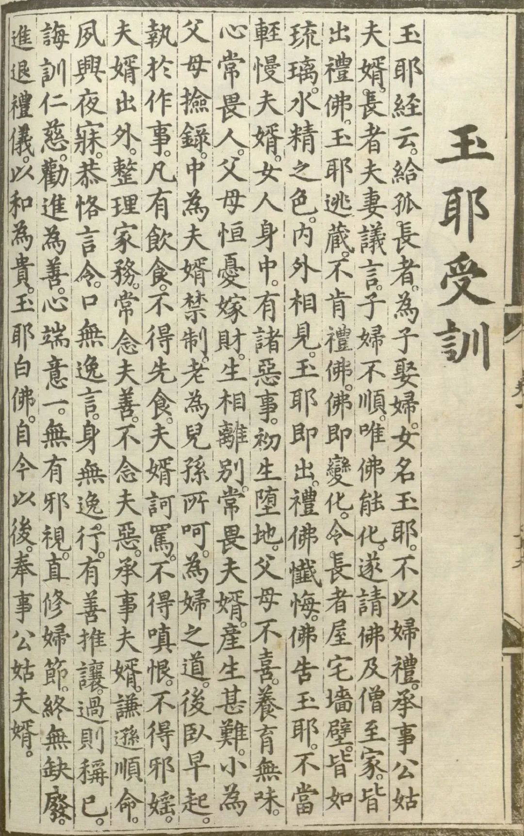 佛告玉耶。不当轻慢夫婿。女人身中有诸恶事。初生堕地。父母不喜。养育无味。心常畏人。父母恒忧嫁财。生相离别。常畏夫婿。产生甚难。小为父母所捡録。中为夫婿禁制。老为儿孙所呵。为妇之法。后卧早起。执于作事。凡有饮食。不得先食。夫婿诃骂。不得嗔恨。不得邪淫。夫婿出外。整理家务。常念夫善。不念夫恶。承事夫婿。谦逊顺命。夙兴夜寐。恭恪言令。口无逸言。身无逸行。有善推让。过则称己。诲训仁慈。劝进为善。心端意一。无有邪视。直修妇节。终无缺废。进退礼仪。以和为贵。