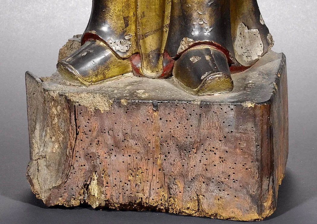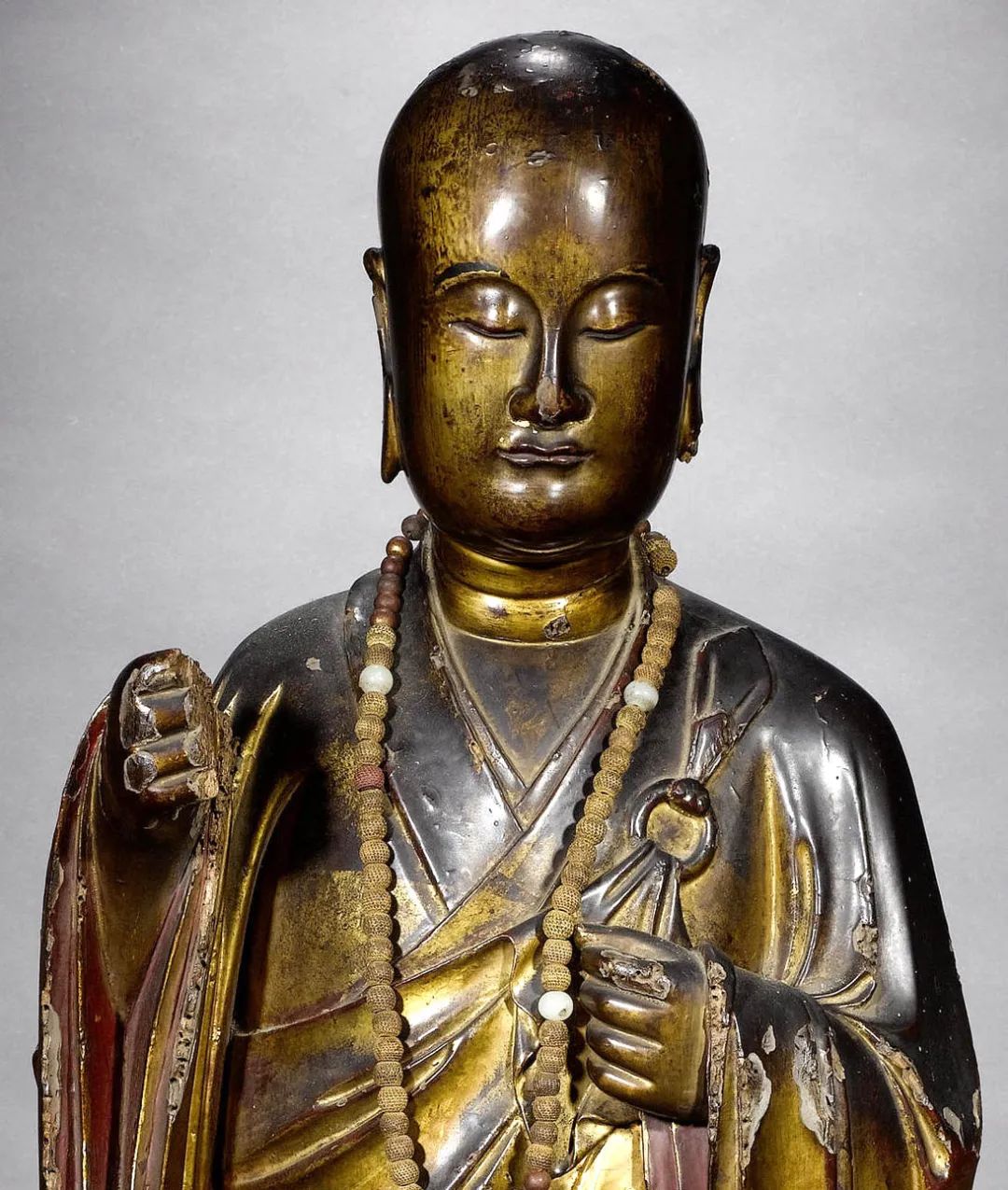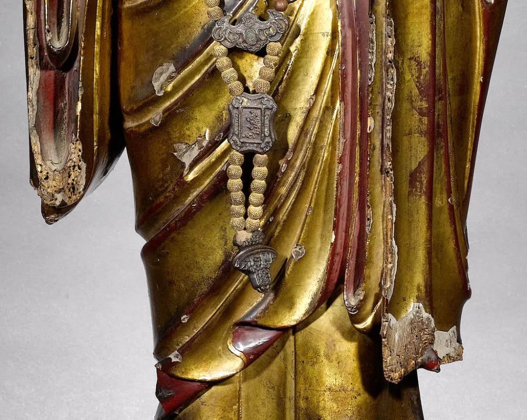 地藏菩萨现比丘相,天庭饱满,地阁方圆,五官俊美,神态宁静安详,法相高雅端庄。身着僧袍,佩戴佛珠,左右手各持杖和珠(持物已失)。身着汉式僧衣,衣褶流畅自然垂下,衣角下摆翻卷,似有风动之感。整尊造像雕刻精细,镀金木雕泛出金属质感,凸显地藏菩萨慈悲大愿之庄严法相。地藏菩萨,或称地藏王菩萨,曾音译为“乞叉底蘗沙”。因其“安忍不动如大地,静虑深密如秘藏”,故名地藏。为佛教四大菩萨之一,与观音、文殊、普贤一起,深受世人敬仰。以其“久远劫来屡发弘愿”,故被尊称为大愿地藏王菩萨。地藏菩萨因立下要度尽六道中生死流转众生的大愿,故而常现身于人、天、地狱等六道之中,而有六地藏之称,其名号与形象如下: