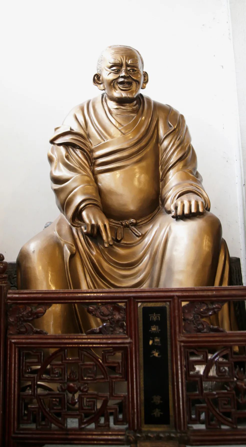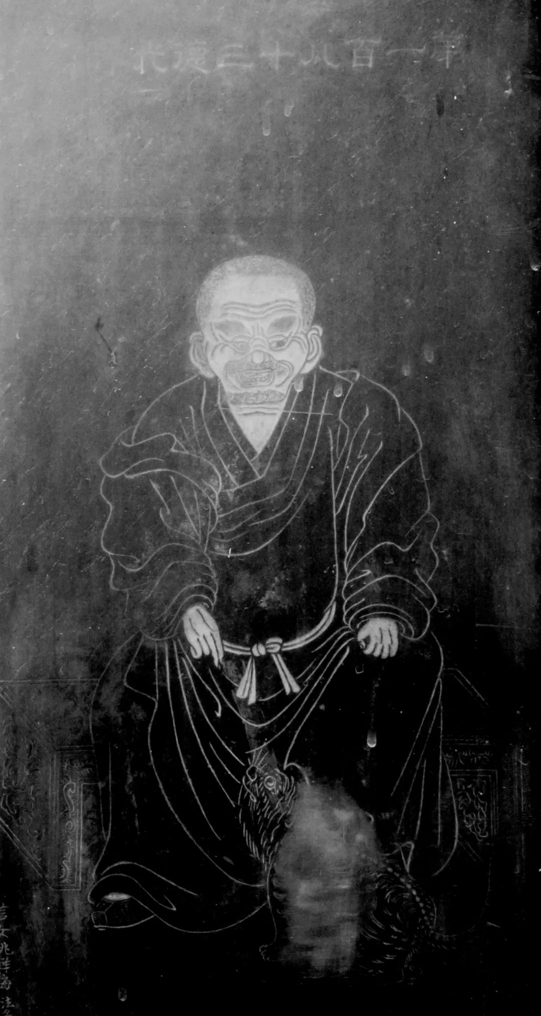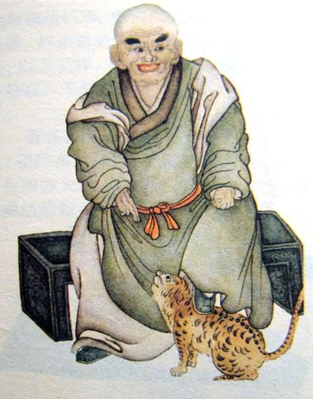 尊者法相所现为陶然而坐,脚踏灵猫,左手握拳置于膝上,右手伸指戏猫,神态慈和,眉开眼笑。尊者精进不息,著有多部佛家论典。