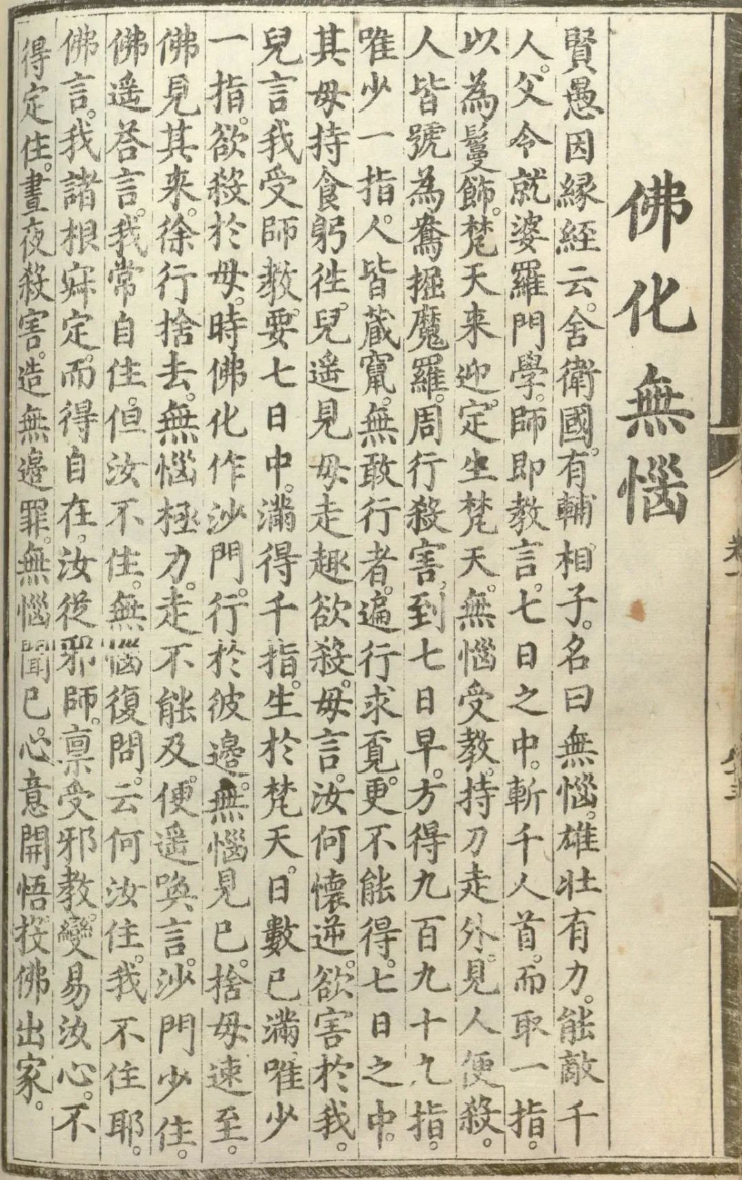 《贤愚因缘经》上说:舍卫国大臣宰相有一儿子名无恼,雄壮有力,能敌千人。父亲叫他去向婆罗门学法。婆罗门对他说:“你能于七日之中、斩千人头,每人取其一指,共合千指,串成指环。待你命终之后,便可蒙梵天接引,往生梵天。”