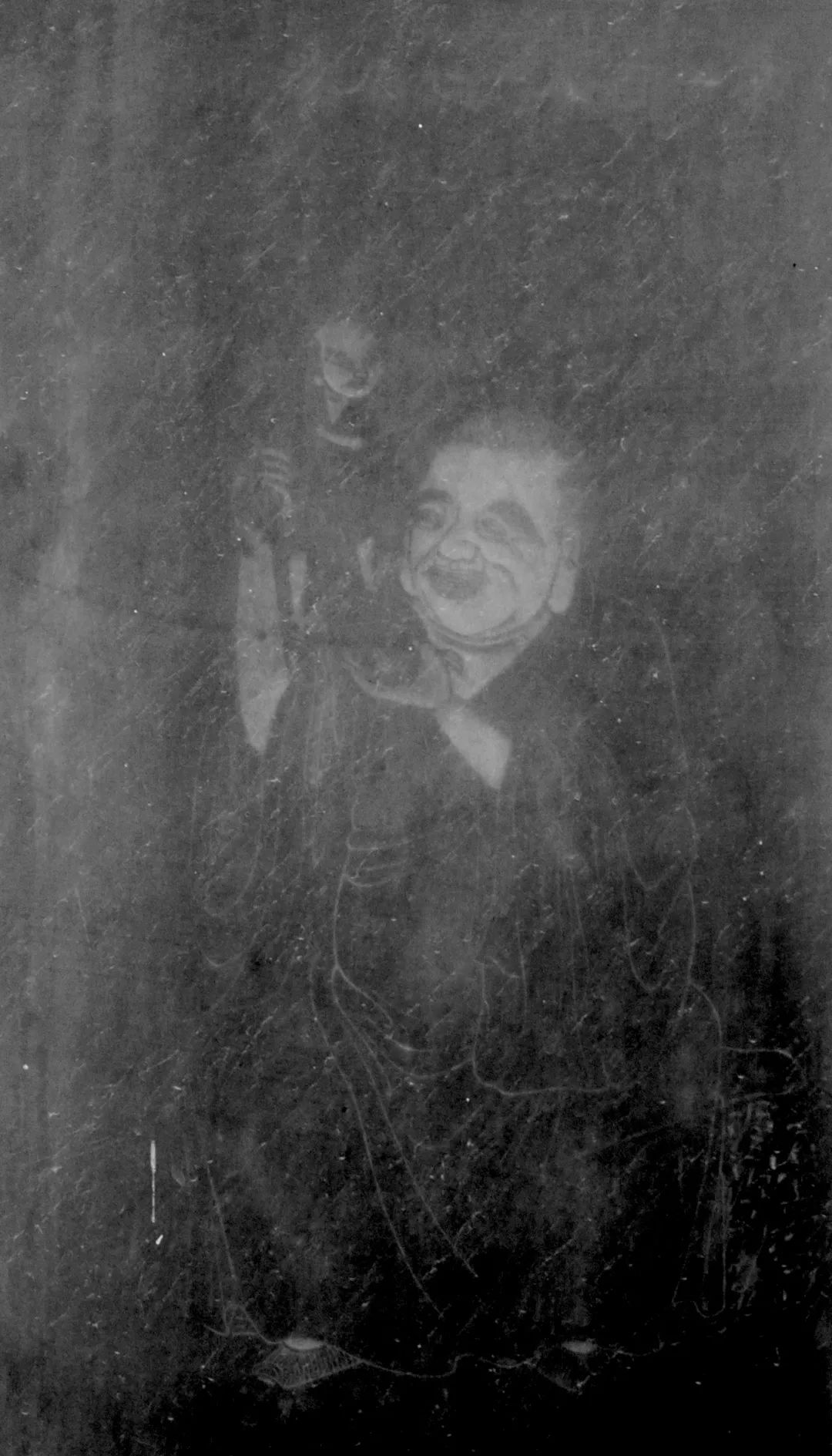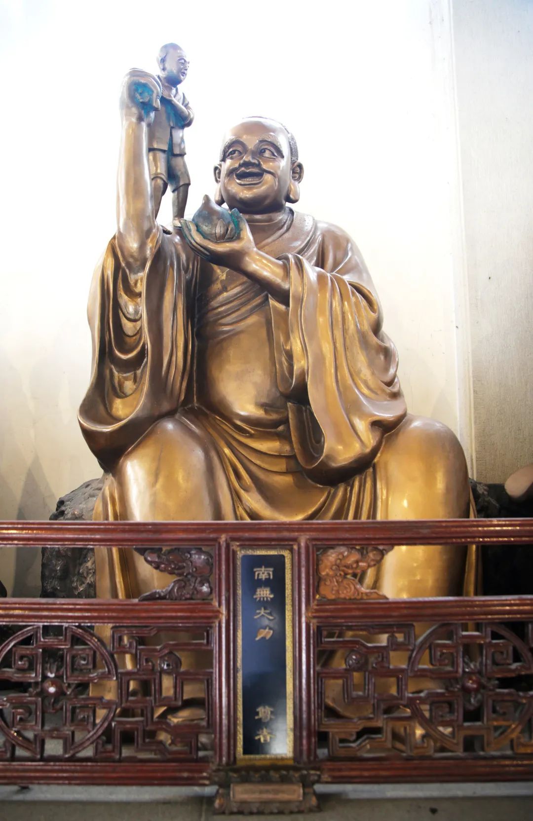 尊者法相所现为陶然而坐,左手托蟠桃,右肩站一童子,右手握孩童之手,神情欢乐,喜笑颜开。尊者神通广大,护持佛法,智慧无量。