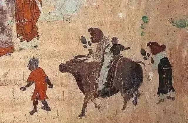有信仰的中国古人,家庭团聚时会选择集体顶礼膜拜。在莫高窟第323窟南壁的佛教史迹画中,保留有一家老少四口前往江边瞻礼佛像的有趣画面,这其实也是一幅家庭出游图。画面中奶奶和孙子一起坐在水牛背上,奶奶和主妇手持花朵预备供佛,饶有趣味。