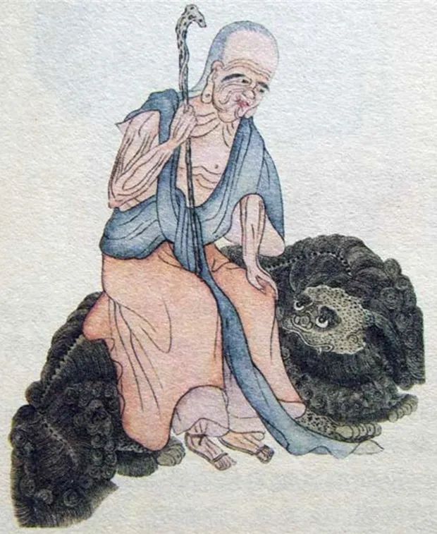 尊者法相所现为悯然静坐于神兽之上,左手护膝,右手执拄杖,衣衫单薄,容色清苦,体形瘦削,广额大耳,为苦行之貌。尊者修持大乘六度,勇猛精进求大菩提,以慈悲之心教化众生。