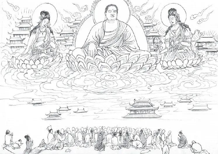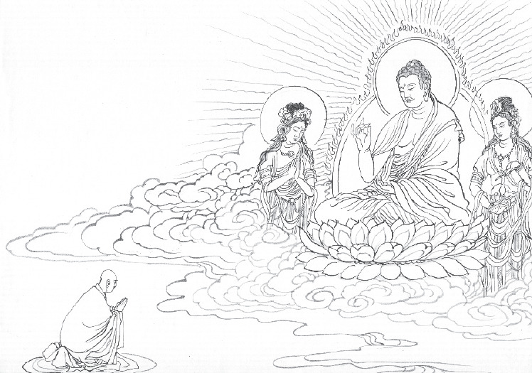 大师又问:“当云何念?”文殊菩萨开示:“此世界西,有阿弥陀佛,彼佛愿力不可思议,汝当继念,令无间断,命终之后,决定往生,永不退转。”说后,菩萨为大师摩顶,并为他授记:“汝以念佛故,不久证无上正等菩提。若善男女等,愿疾成佛者,无过念佛,则能速证无上菩提。”语讫,二位大圣互说偈颂。大师恭敬聆听,法喜充满,作礼而退。