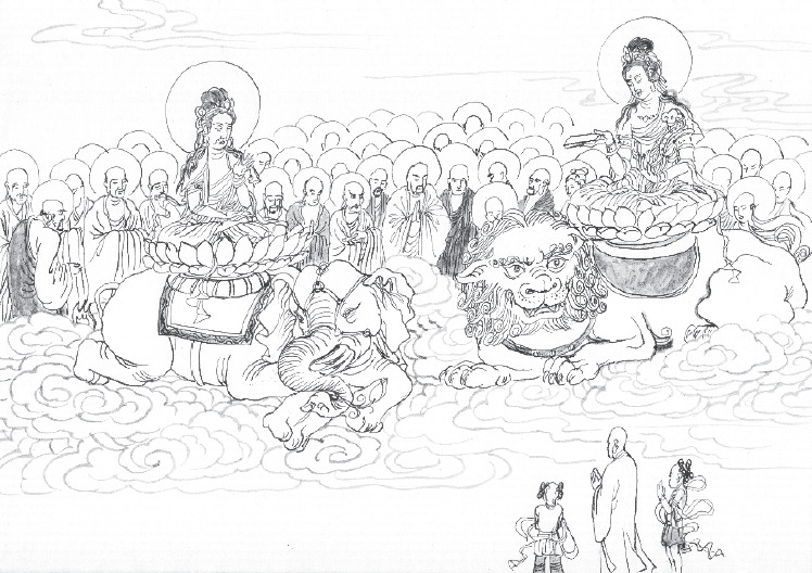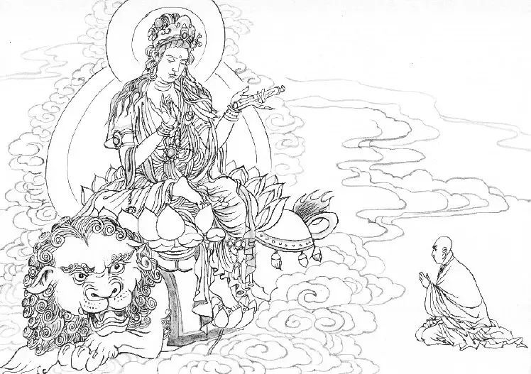 大历五年(770)四月五日,大师等数人到了五台山,蒙佛光照引,寻至大圣竹林寺,看见文殊菩萨与普贤菩萨端坐在讲堂狮子宝座上,为众说法,历历可闻。