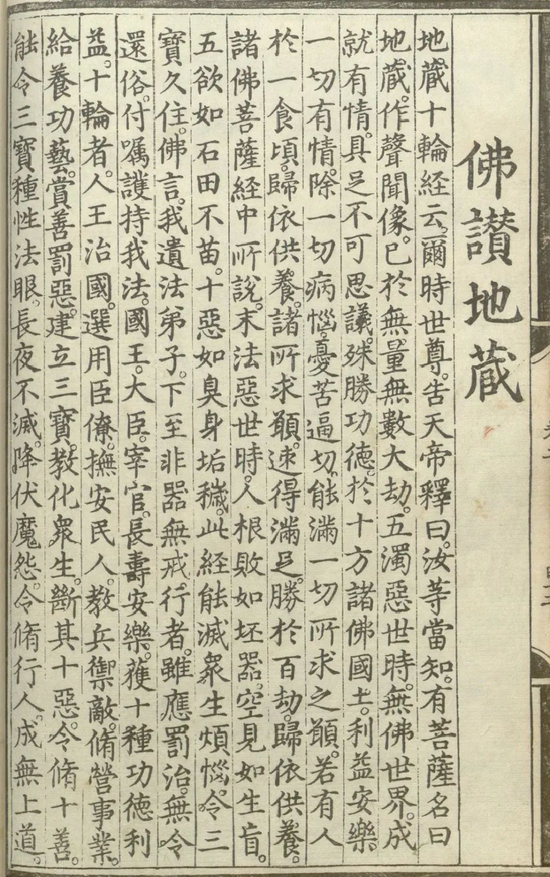 《地藏十轮经》上说:有一天,世尊对天帝释说:“你们应当知道,有一菩萨名地藏,具足不可思议殊胜功德,他于久远劫以来,常常示现声闻的形象,不但在五浊恶世没有佛法的时期,以种种方便教化成就有情,亦于十方诸佛国土利益安乐一切有情,帮助众生除灭一切病恼,满足一切所求善愿。若有人能于一顿饭的工夫,至心称念地藏菩萨的名号,归依供养,所求之愿很快就能满足,胜于百劫皈依供养诸佛菩萨。”